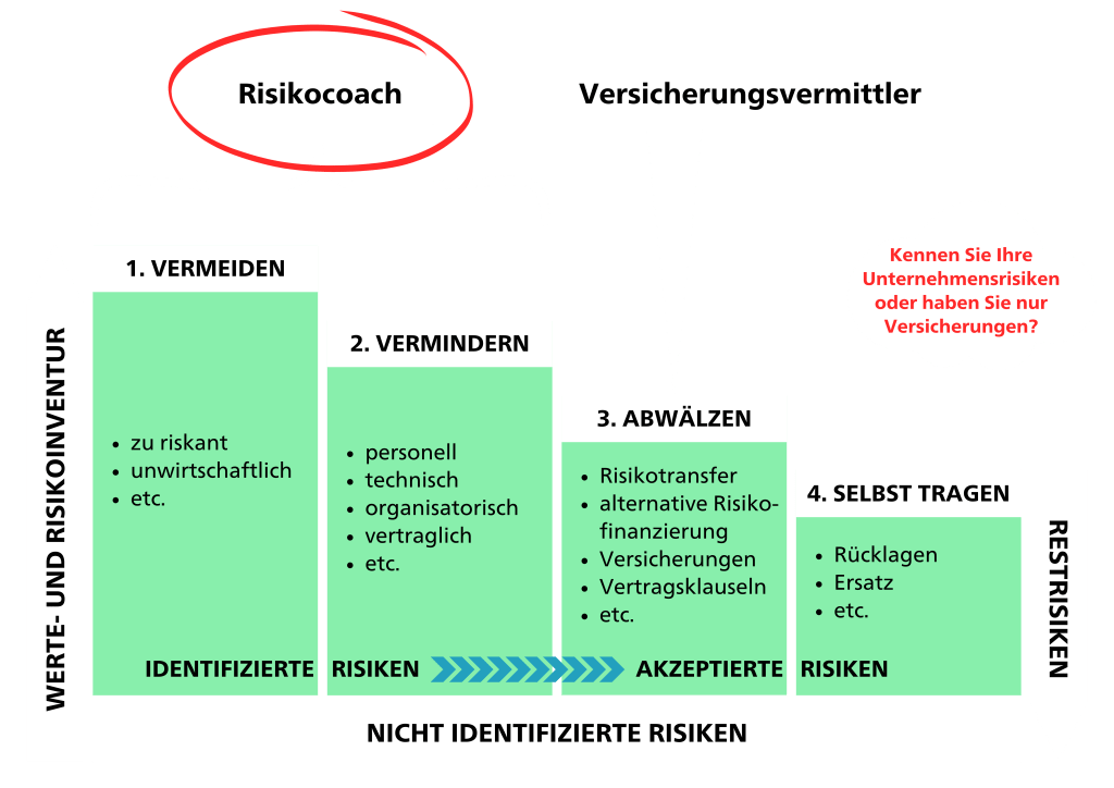 Während der Makler oder Vermittler nur auf das „Abwälzen“ des Risikos in Form von Versicherungen schaut, erweitert der Risikocoach diesen Blick um weitere Möglichkeiten, die Risiken Ihres Unternehmens zu vermeiden oder zu vermindern. Dafür werden die Risiken identifiziert, genaustens analysiert und bewertet, um ein möglichst klares und vollständiges Bild zu zeichnen und Ihnen eine fundierte Entscheidung hinsichtlich der Umsetzung der vorgeschlagenen Maßnahmen zu ermöglichen.