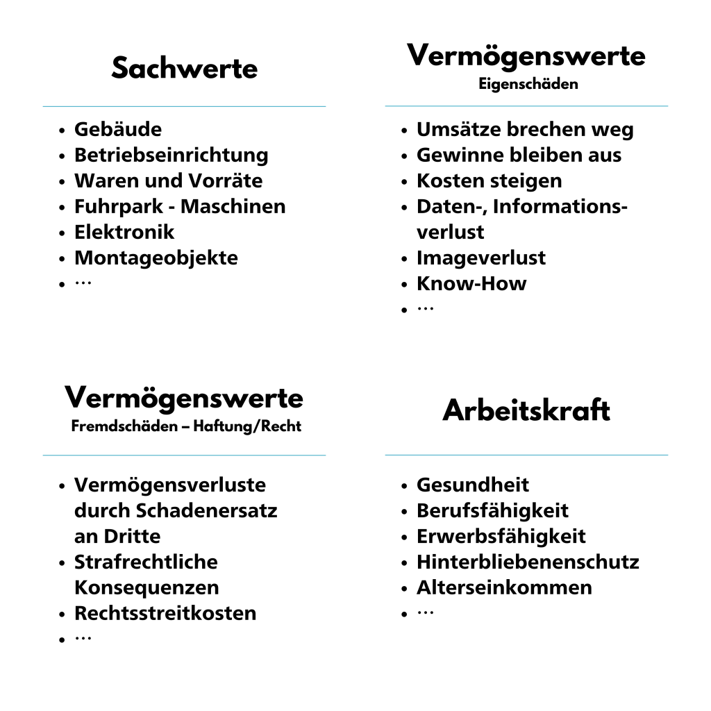 Kennen Sie wirklich alle Werte Ihres Unternehmens? Was kostet zum Beispiel jeder Tag Betriebsunterbrechung durch eine Pandemie, einen Stromausfall, ein Feuer oder einen Computerausfall? Welchen Wert hat Ihre persönliche Arbeitskraft? Wie hoch ist der Schaden, wenn Außenstände durch die Insolvenz Ihrer Großkunden abgeschrieben werden müssen?